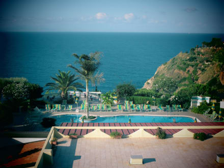 Ausblick aus dem Zimmer auf den Pool und das Meer