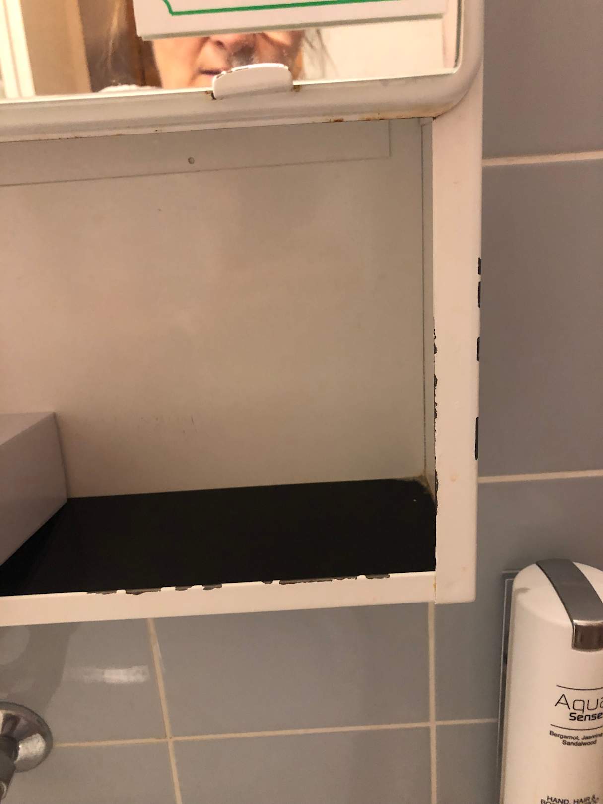Ringsherum abgeblätterte Farbe am Spiegel.