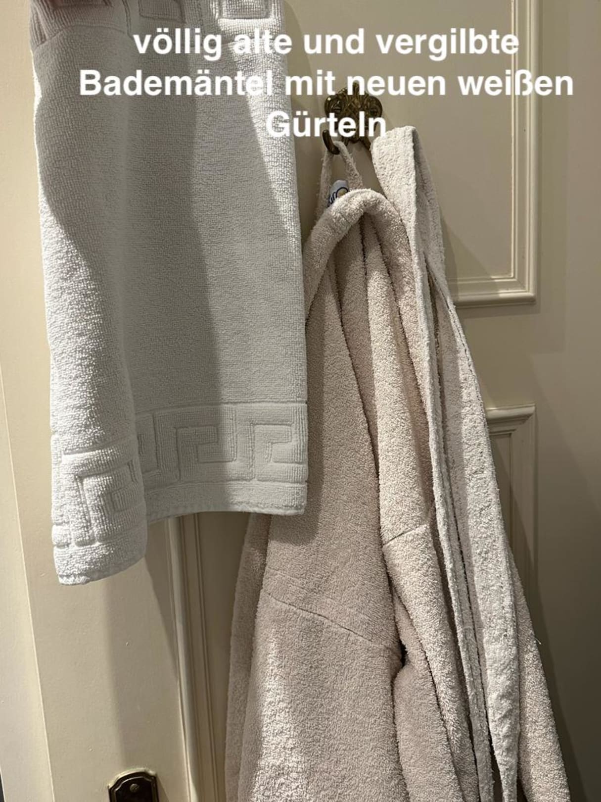 Bademantel total vergilbt, schreiben Gäste schon seit Jahren. Nur der Gürtel wurde mal erneuert und ist weißer, als Vergleich daneben ein weißes Handtuch!