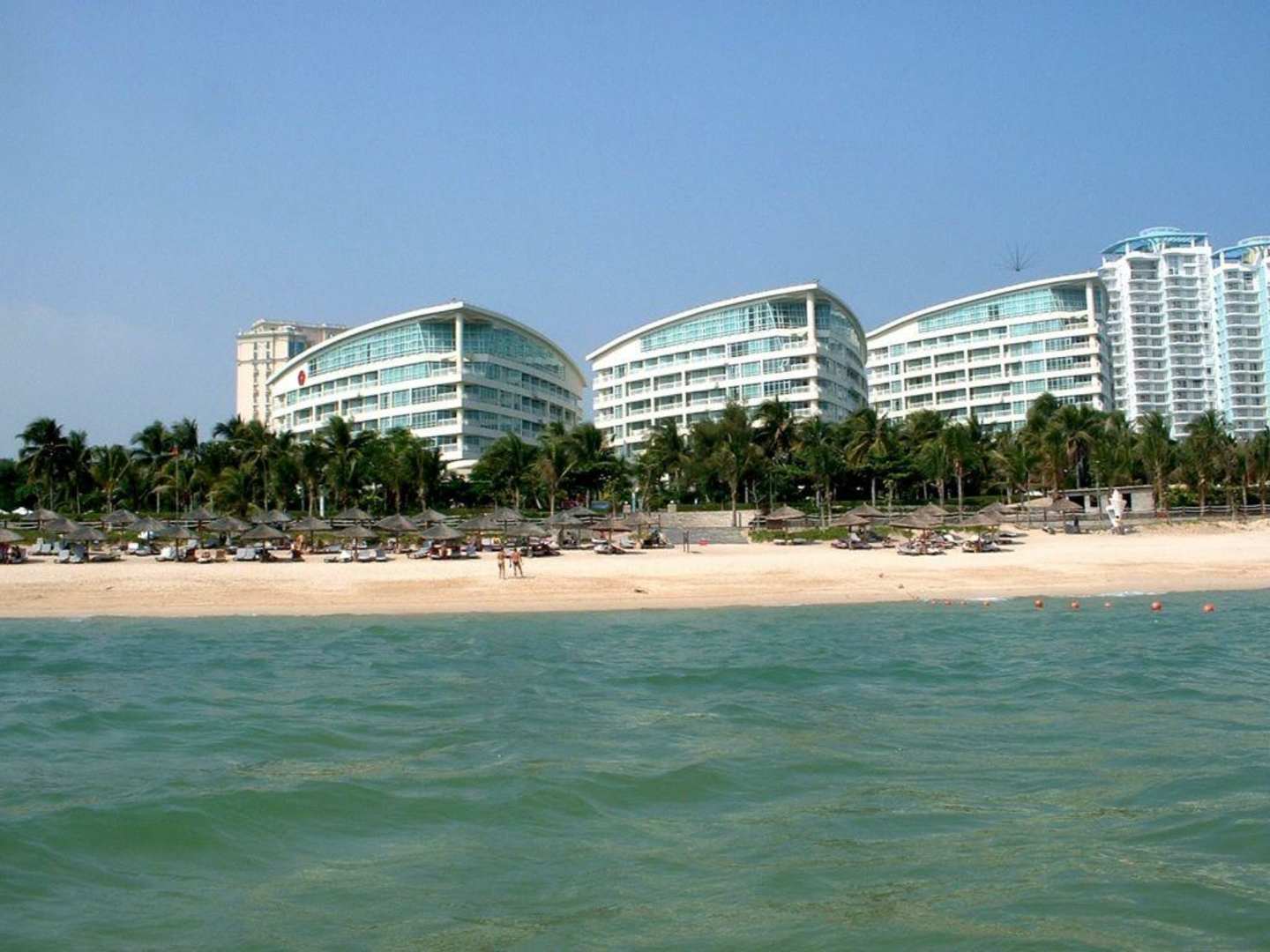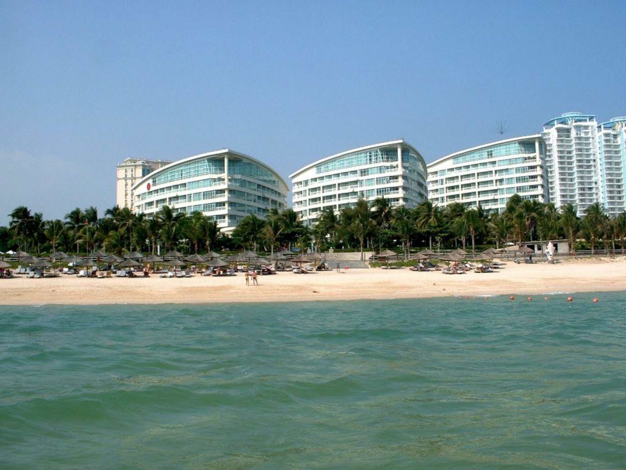 Intime Resort Dadonghai/SanyaAnsicht der 3 Schiffs-Bug-ähnlichen Zimmertrakte vom Meer aus über den sehr gepflegten Hotelstrand