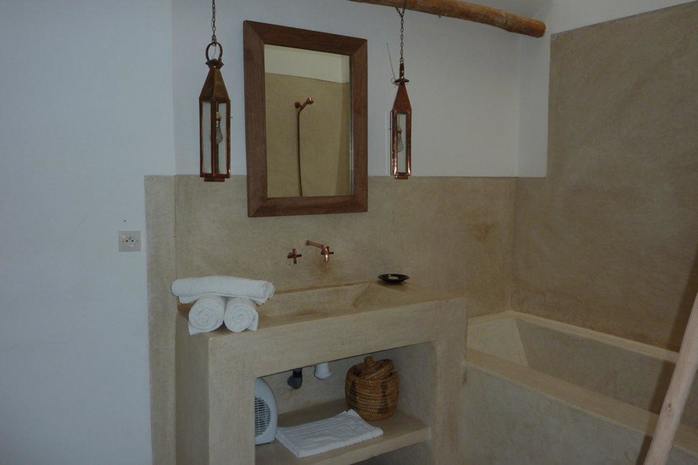 Alle Bäder sind mit der marrokanischen Tadelakt-Technik (=spezielle Spachtel- u. Reibetechnik mit Kalk) gemacht und mit sehr schönen Lampen ausgestattet.