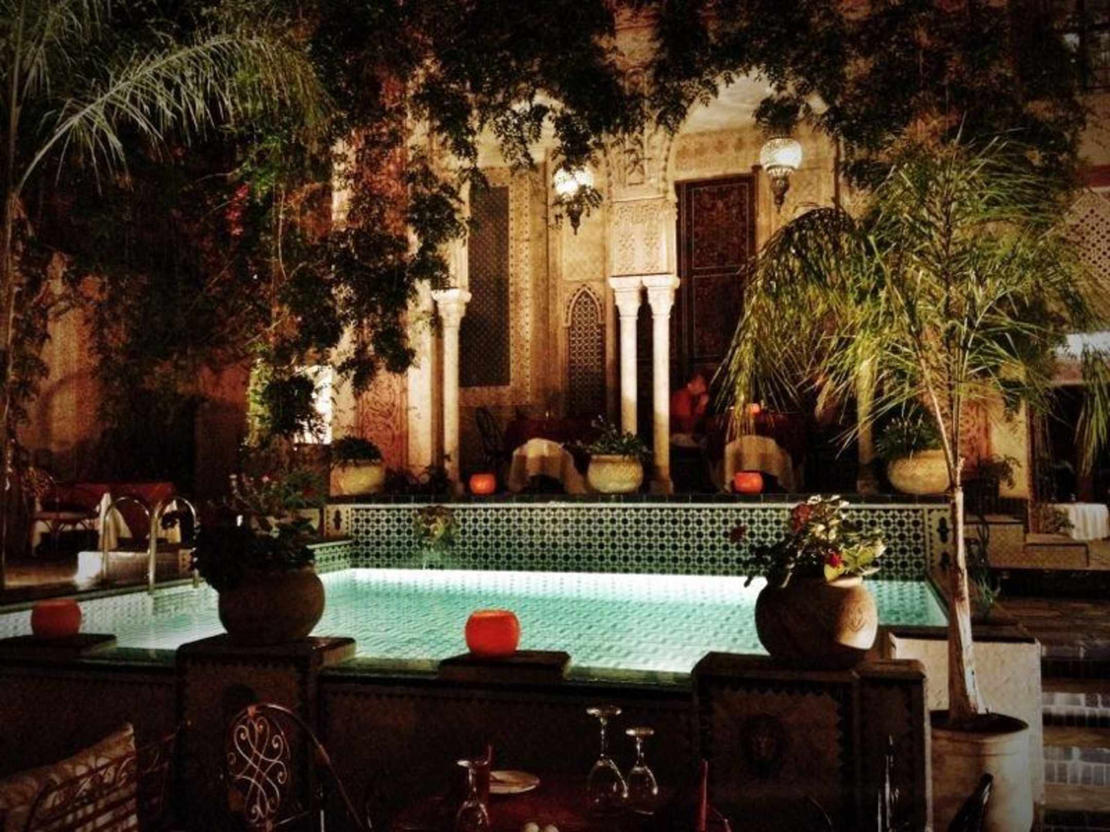 Plunge pool and restaurant during the evening