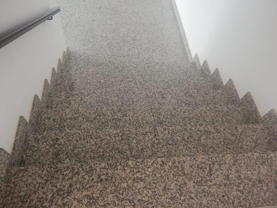 Unfallgefahr: Fehlende Markierung an der ersten und letzten Treppe. Menschen mit Sehproblemen können nicht erkennen wann die Treppen anfangen bzw. aufhören.