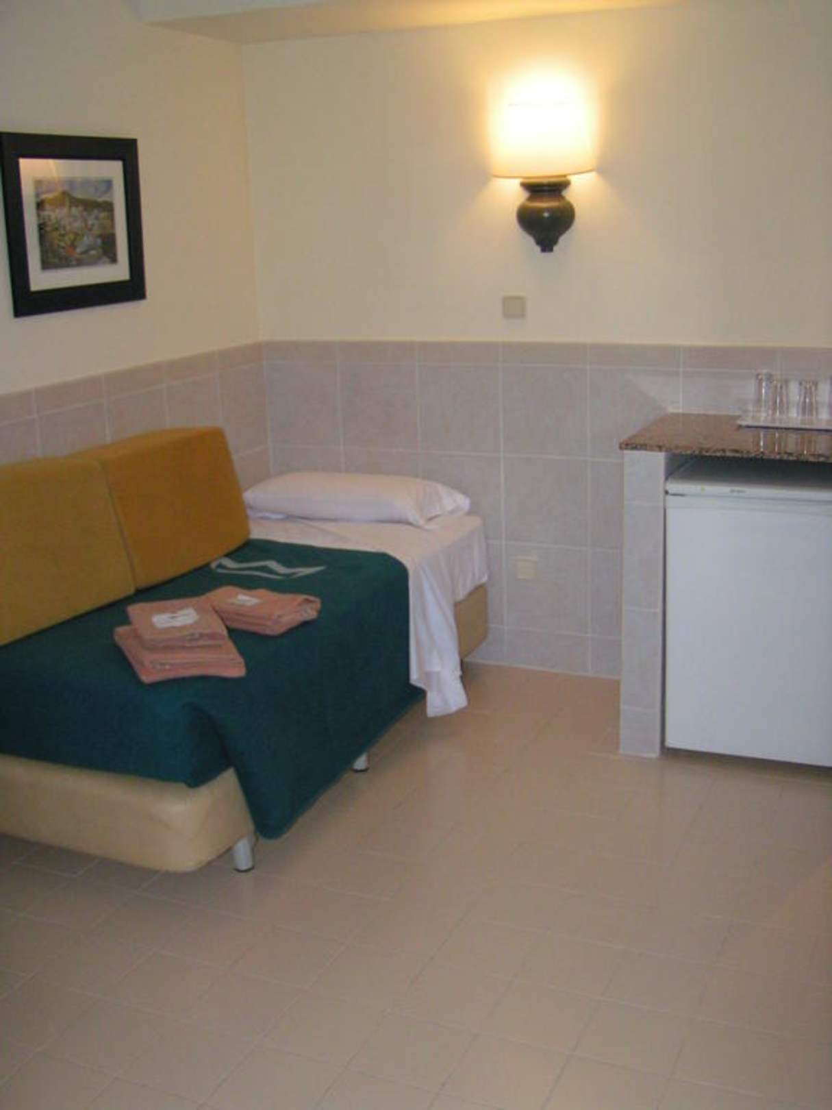 Schlafsofa daneben der Kühlschrank
