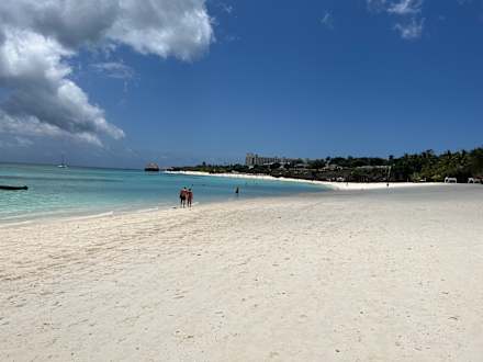 Schöner, feinpuderiger Sandstrand. Hotel im Hintergrund!