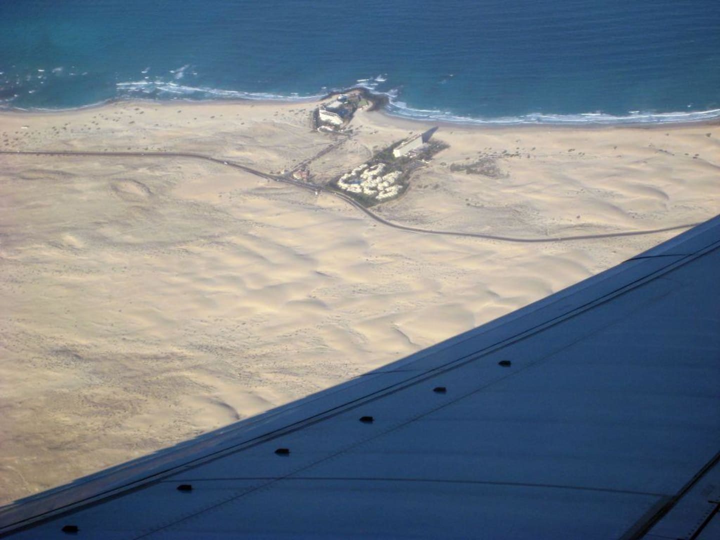 Hotelstrand aus luftiger HöheAuf unserem Rückflug bat sich uns ein schöner Blick auf die RIU Hotels und die sehr weitläufige Dünenlandschaft.