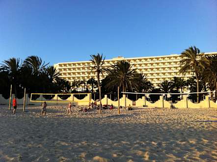 Blick vom BeachvolleyballfeldVon Süden nach Norden blickend auf das Hotel (Bereich Village links hinter den Palmen, verdeckt).