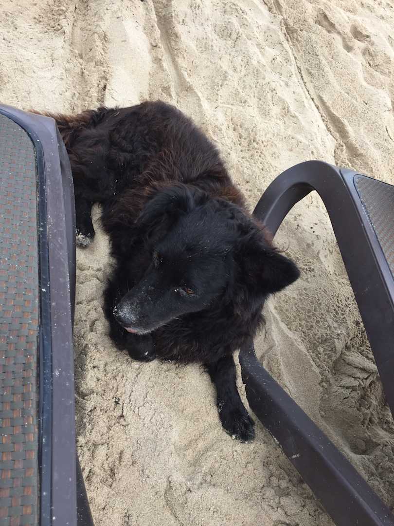 3-4 Hunde am Strand. Haben sich gerne zu den Urlaubern oder auch unter die Liege gelegt. Sehr süß.