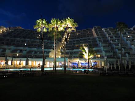 Hotelansicht vom Pool aus am Abend