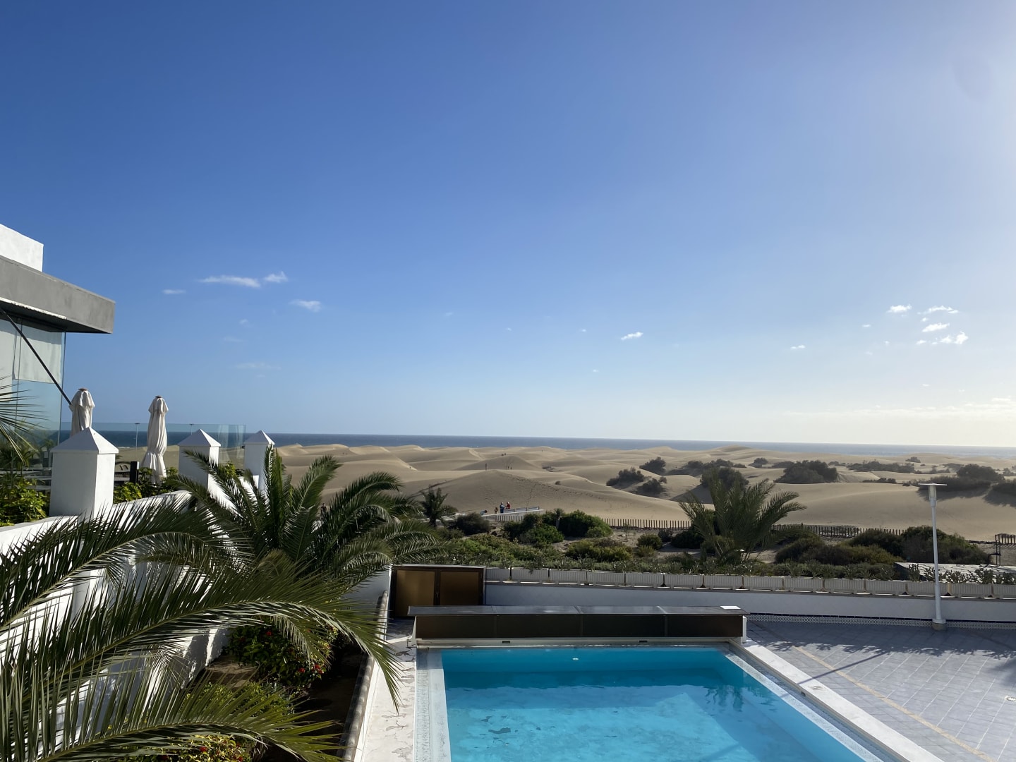 Wunderschöner Ausblick vom Café an den Dünen. Pool ist privat, nicht vom hotel !