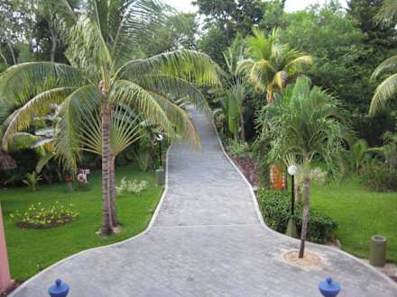 Blick von unserem Zimmer/Wohnhaus auf den Weg durch den Garten zur Lobby