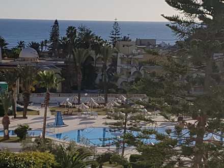 Blick auf den Pool am Abend vom Balkon