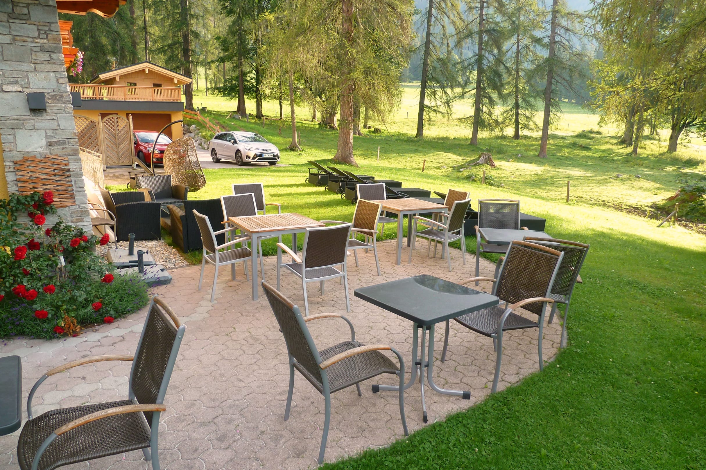 Hotelterrasse und Liegewiese.