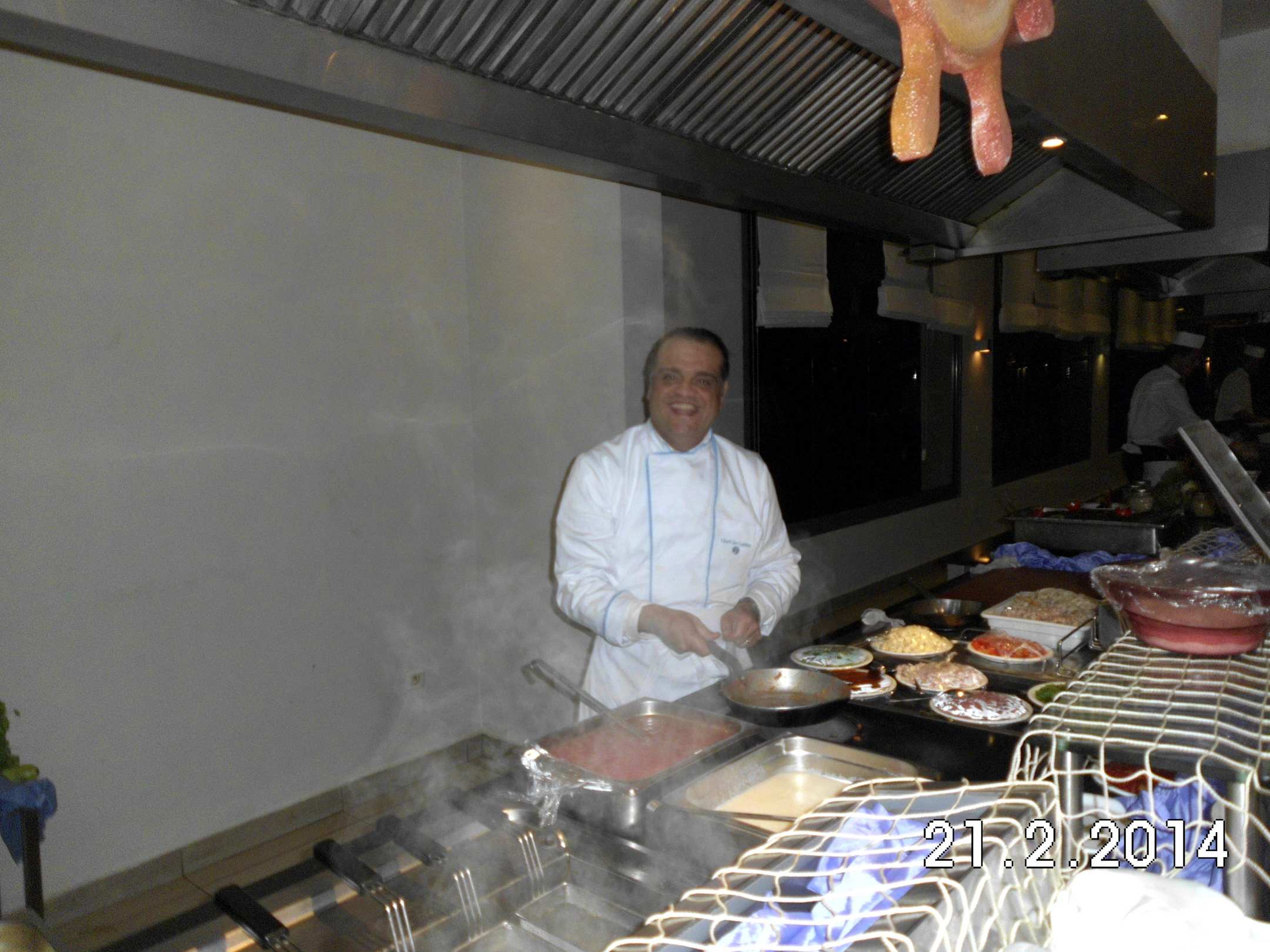 RestaurantEin toller Direktor, der mit den Köchen zusammen das Abendessen zubereitet