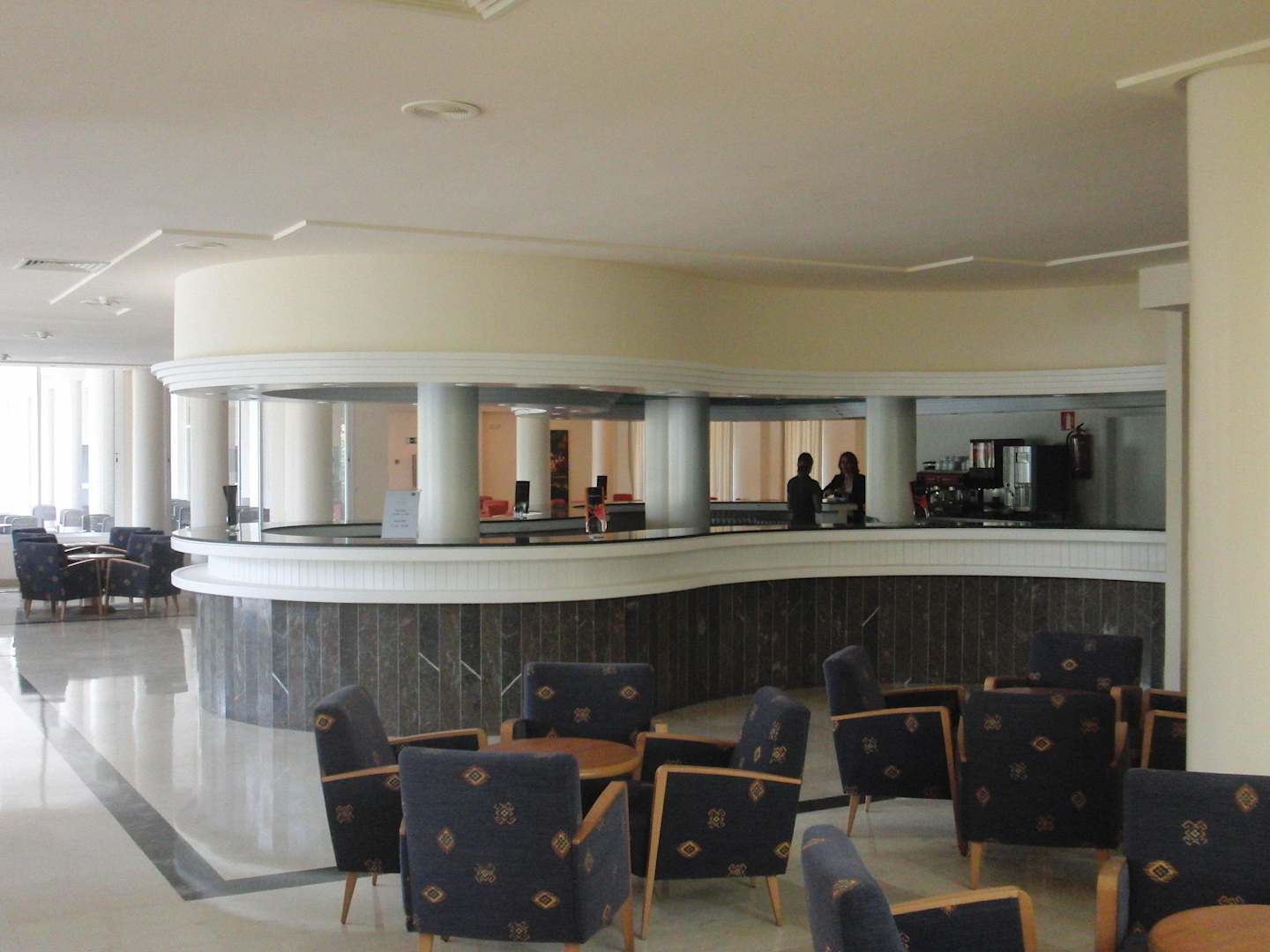InnenbarInnenbar aus Rtg. Rezeption und blaue Bestuhlung, hinter der Bar geht der Raum weiter mit roter Bestuhlung Rtg. Minishowbühne