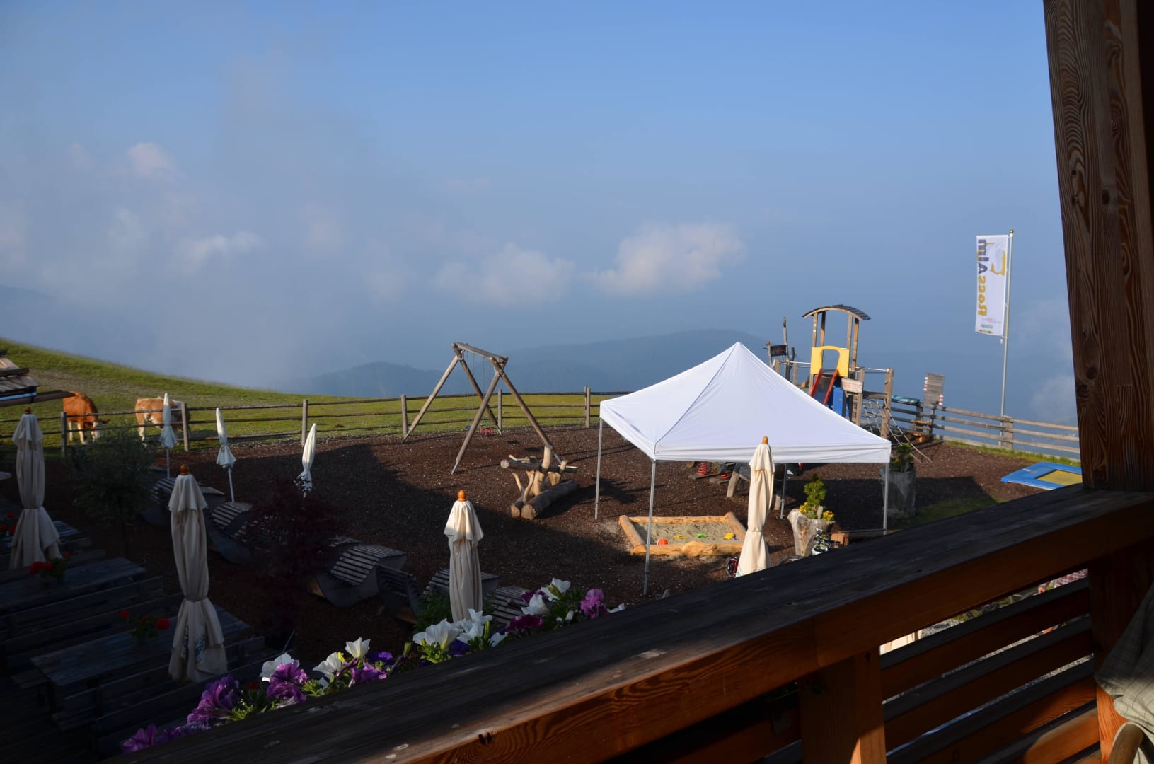 Blick vom Zimmerbalkondie Kühe waren frühmorgens die ersten Gartengäste