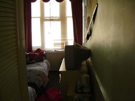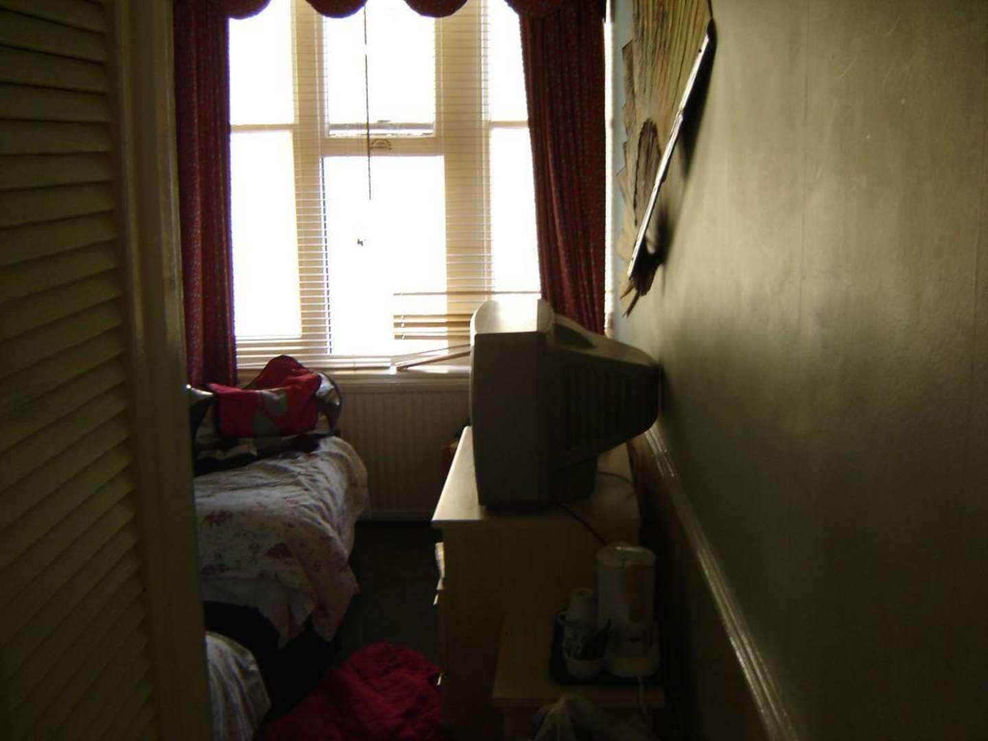 Blick ins Zimmergerade zu befindet sich das Zimmer mit den zwei Betten, links davon der Wandschrank und das Badezimmer