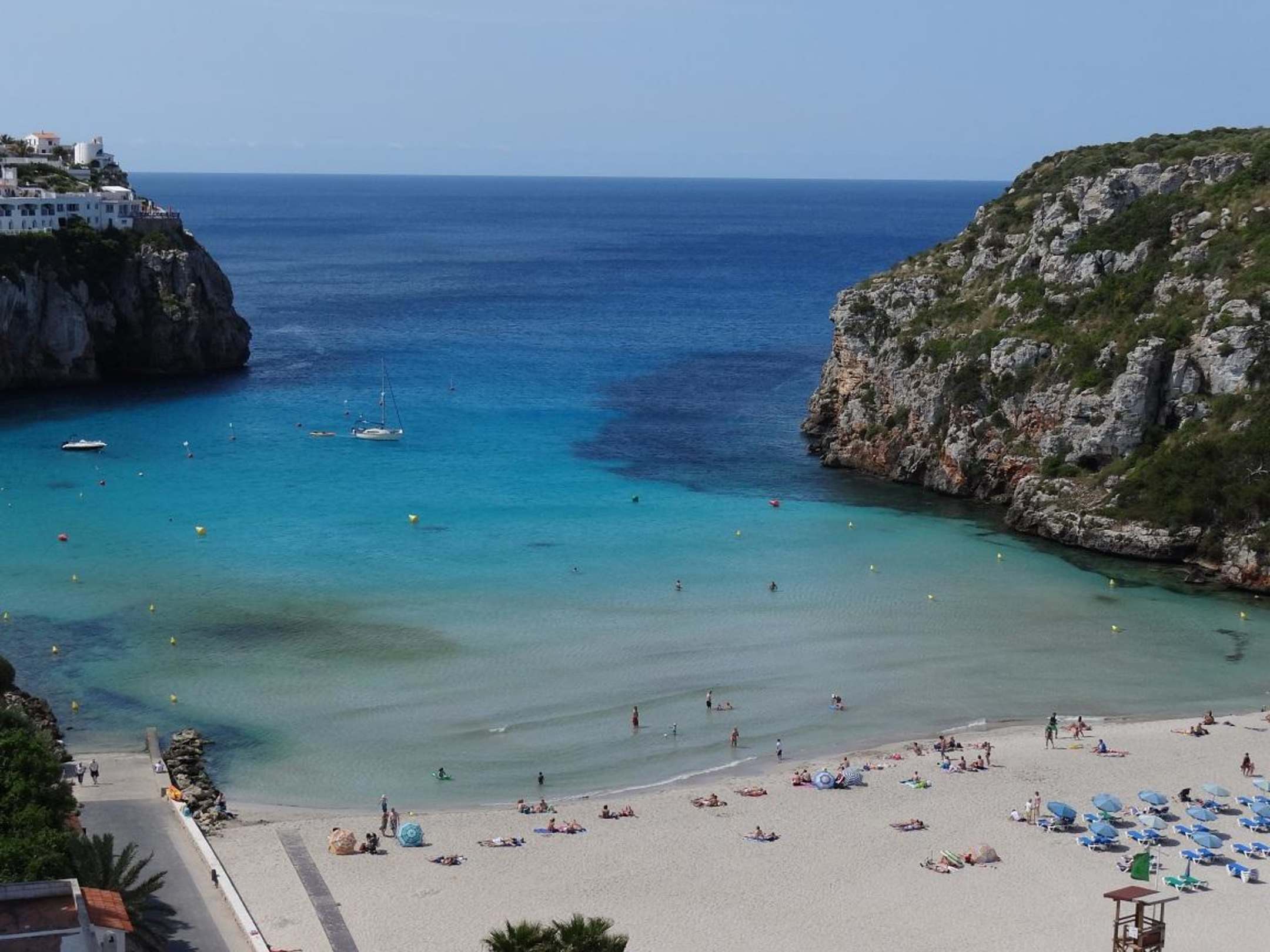 Blick von Hotel-TerrasseWunderschöne Badebucht mit genügend Platz.Liegen und Schirme und Paddelboote mietbar.Wer die Treppen nicht laufen will,oder kann,findet unten Parkplätze fürs Auto.