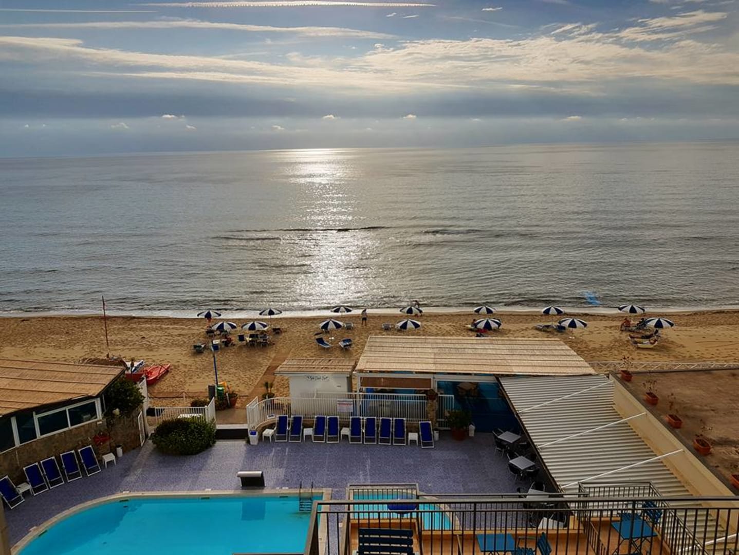 Blick vom Zimmer Schwimmbad und Privatstrand