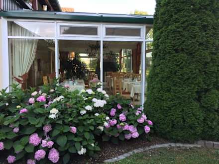 Frühstücksraum mit Eindruck von der schönen Gartenbepflanzung und -pflege