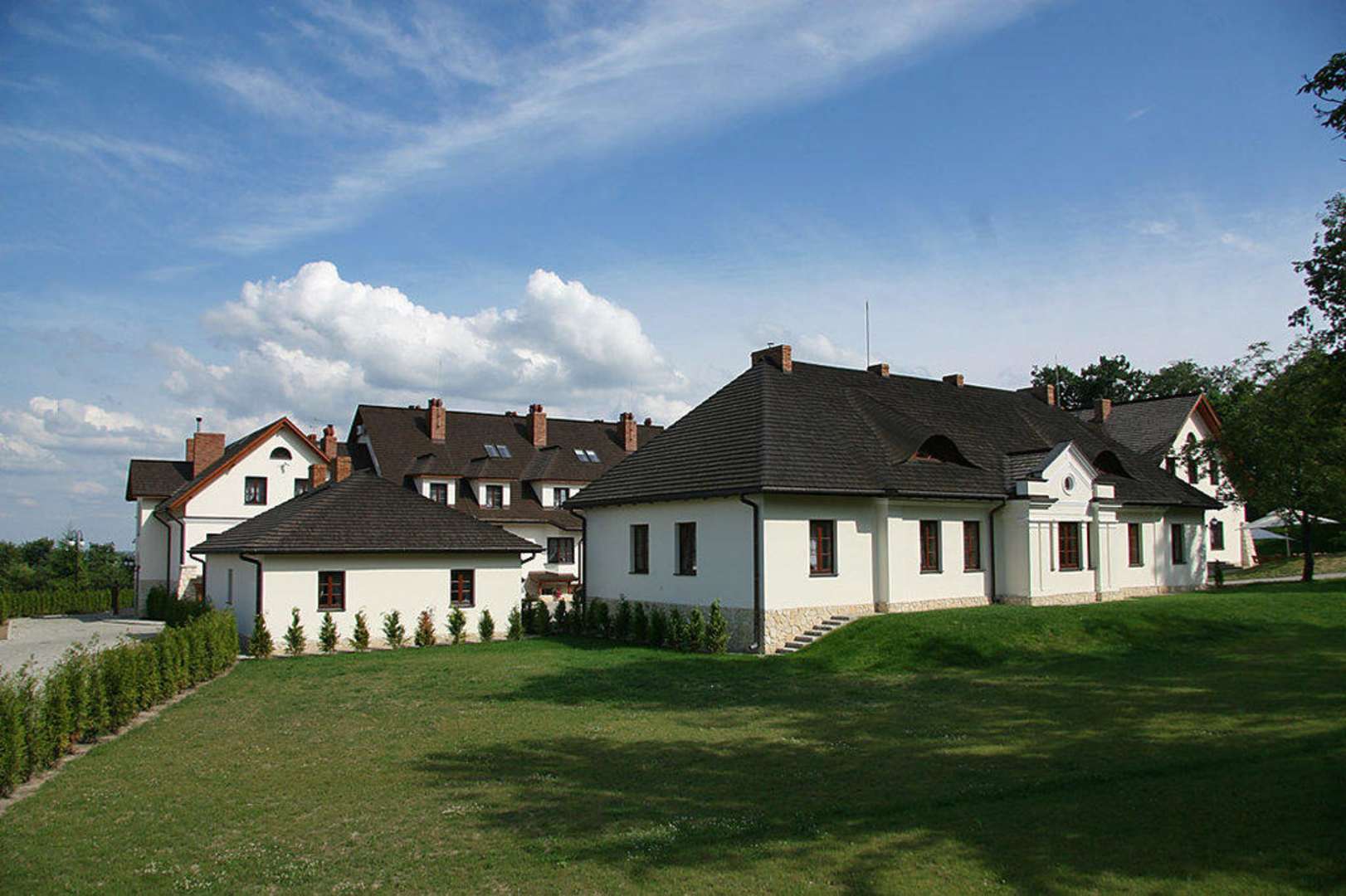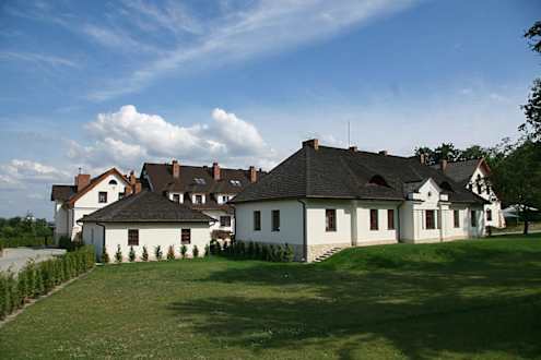 Hotel SarmataWidok na Hotel Sarmata z dolnej bramy wjazdowej - na froncie dworek, obok oficyna, zaś z tyłu schowany hotel i restauracja.