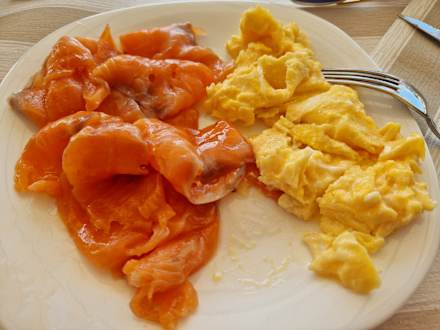 Gastrohandgeschnittenen, mild geräucherten Lachs der Extraklasse gab´s jeden Morgen auf dem reichhaltigen Frühstücksbuffet