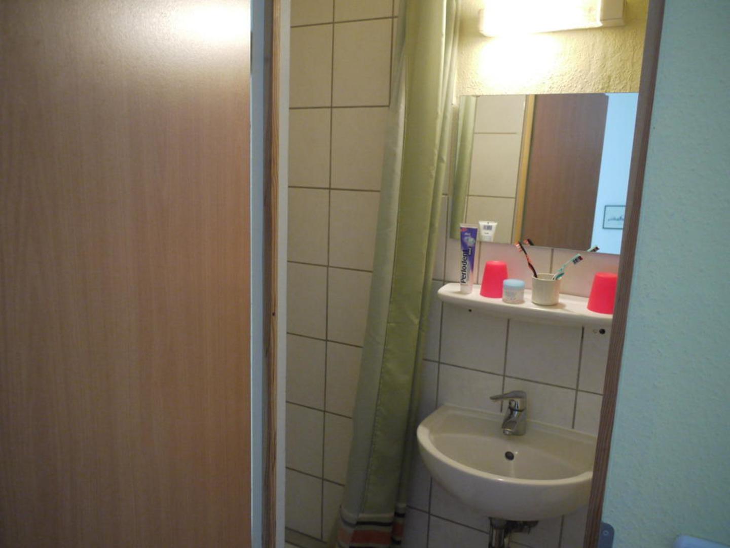 Das BadDas ist das Bad mit Dusche (linke Seite) und Waschbecken mit Ablage und Spiegel.