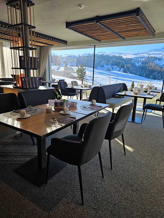 Wunderschöner Frühstücks- und Abendessenraum mit freiem Blick zur Seiser Alm