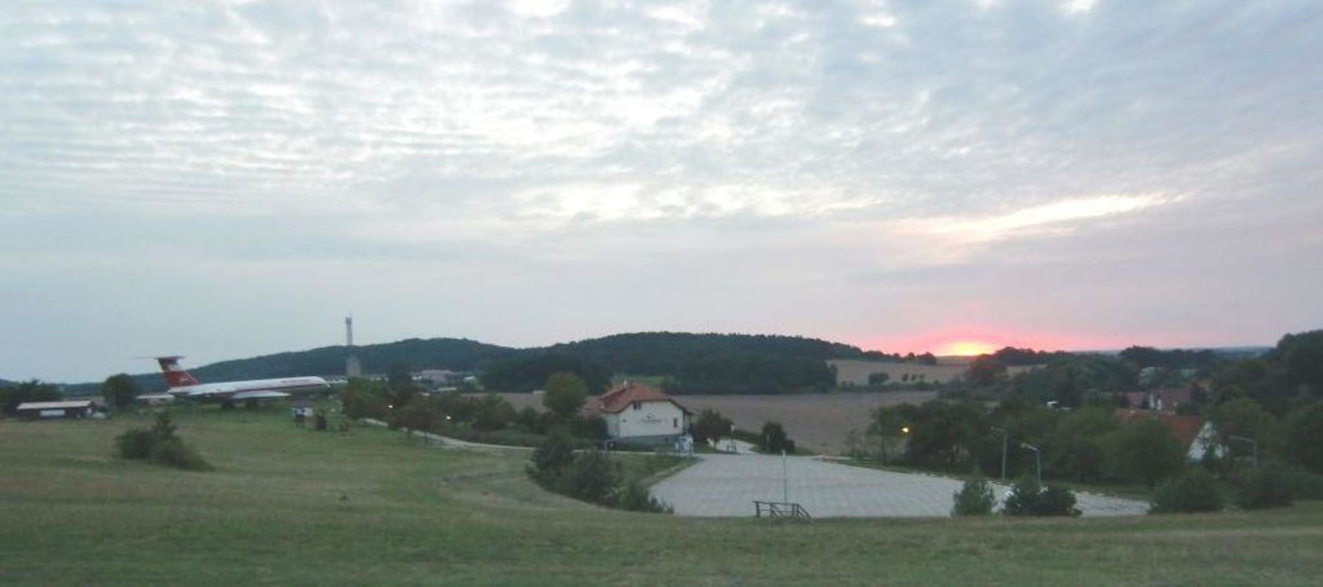 Ein erlebnisreicher Sommerabend geht am Gollenberg zu Ende - mit wunderbarem Blick auf unser Hotel Schwalbennest neben der Lady Agnes / Iljuschin IL 62.