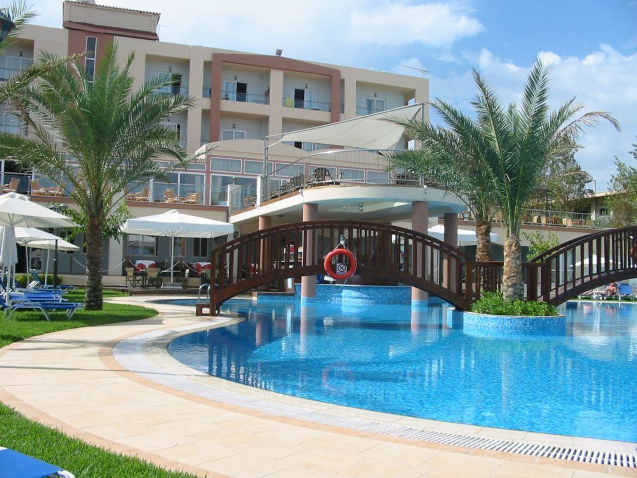 Blick auf den Poolbereich Richtung Haupthaus mit Speiseterrasse.