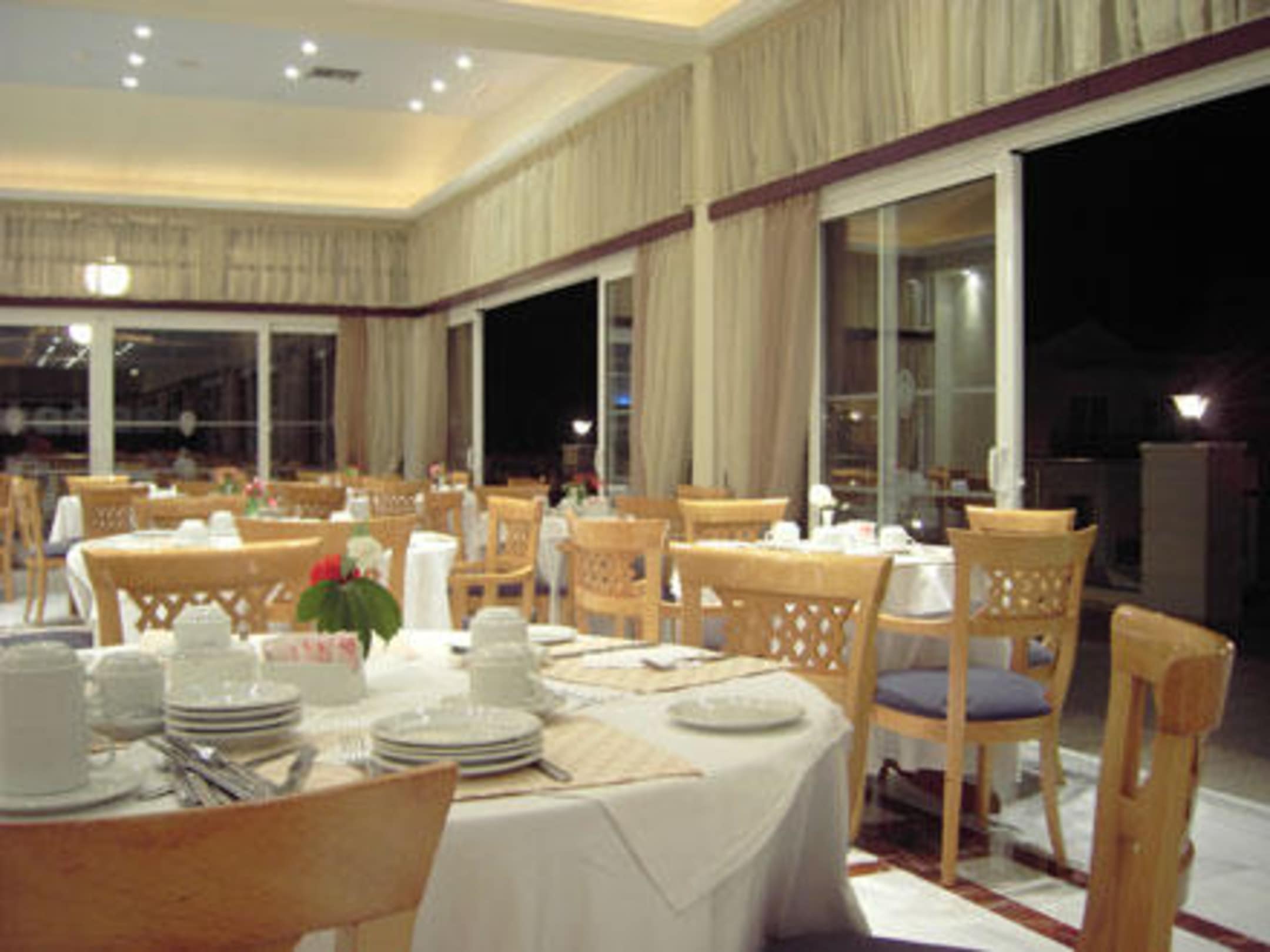 Kreta / Kolymbari / Hotel SeaView, bzw. SeliniClub. Restaurant am Abend (Innenbereich) - Hinter den Scheiben (allesamt Glas-Schiebetüren) sind weitere Sitzmöglichkeiten auf der Freiterasse mit Blick auf die Poolanlage und das Meer.