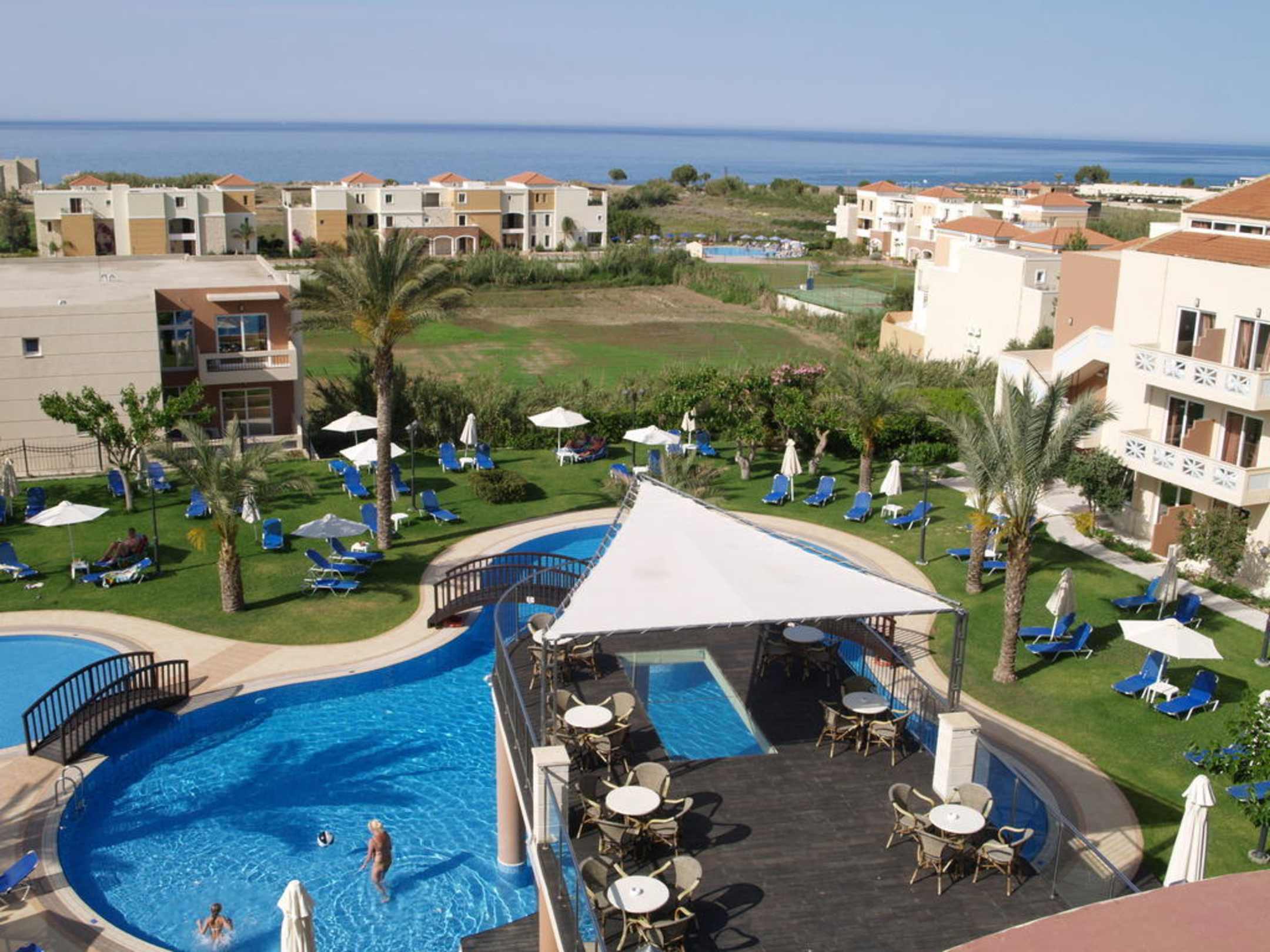 Ausblick vom BalkonBlick auf den Pool, rechts im Bild ein Nebenbäude mit weiteren Zimmern, am unteren Rand des Fotos ist die Poolbar zu erkennen.