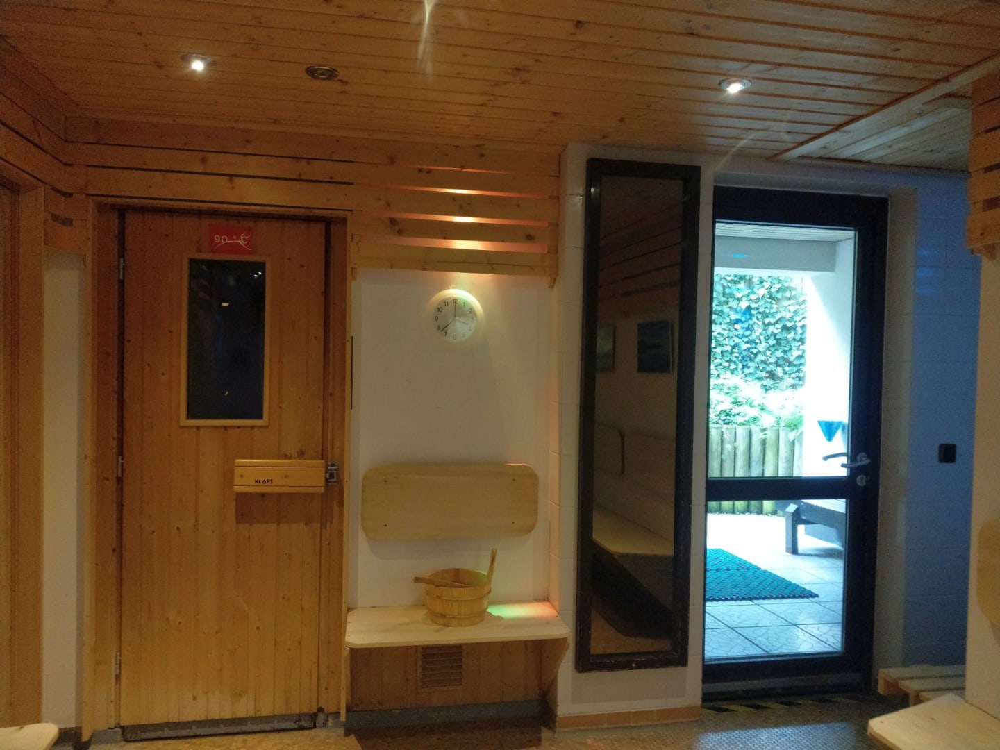 Ein Blick in den Saunabereich mit kleiner Außenanlage