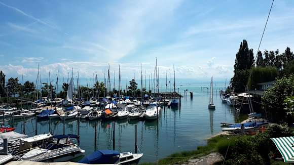 Blick vom Balkon auf den Yachthafen