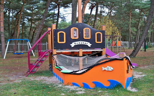 Schön geworden, der neu angelegte Kinderspielplatz im Senatorgarten. Zu sehen ist eine Rutschbahn und ein Sandkasten in Form eines Fischkutters.