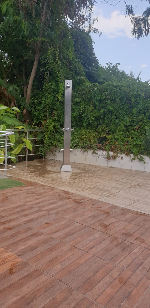 StrandDuschen am Strand aber schnell weil sie im Dauereinsatz ist zwei duschen und zweimal für die Füße das ist die einzige Dusche für alle Gäste