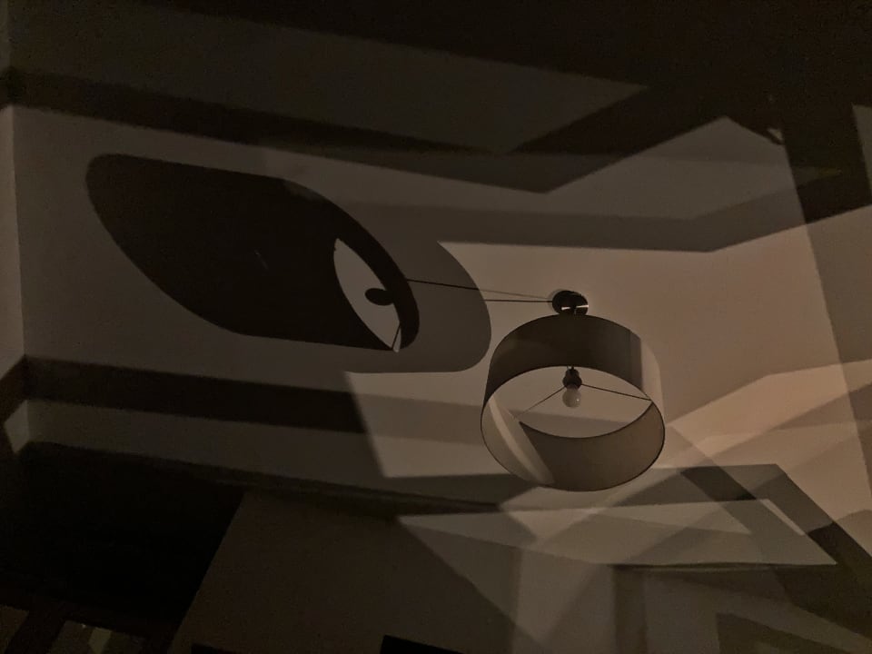ZimmerWaldblickzimmer: eine fast surrealistische Projektion nachts an der Decke des Zimmers durch die draußen an der Straße reinscheinende Leuchte.