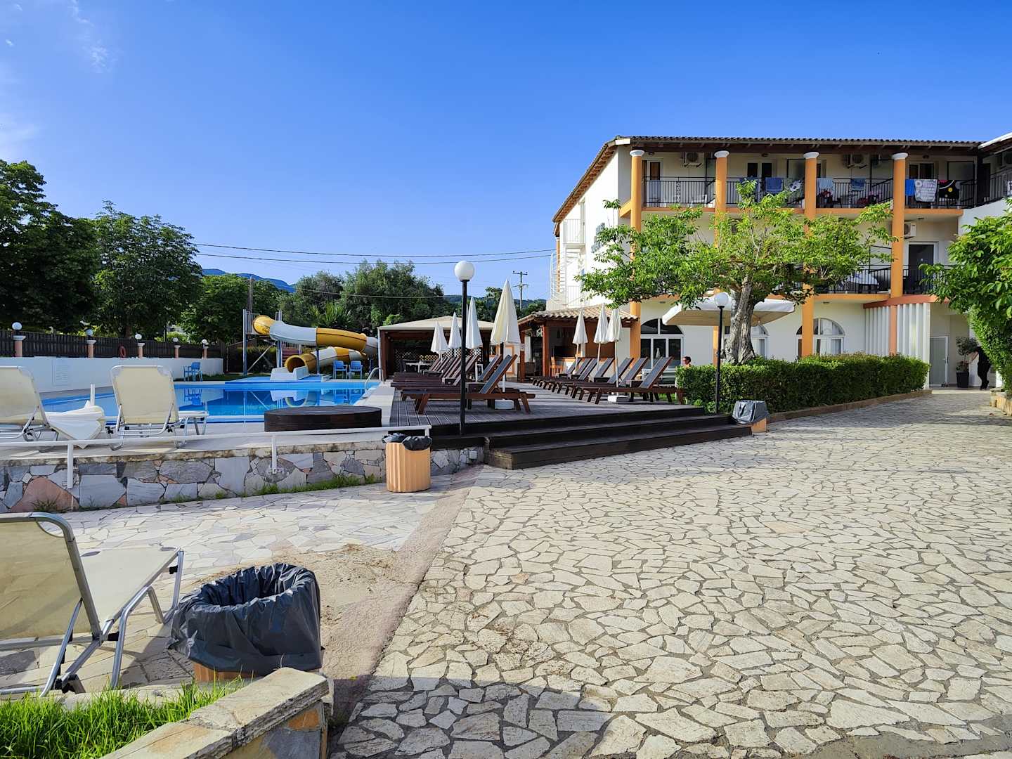 Sicht auf den Pool. Die Rutsche ist geschlossen