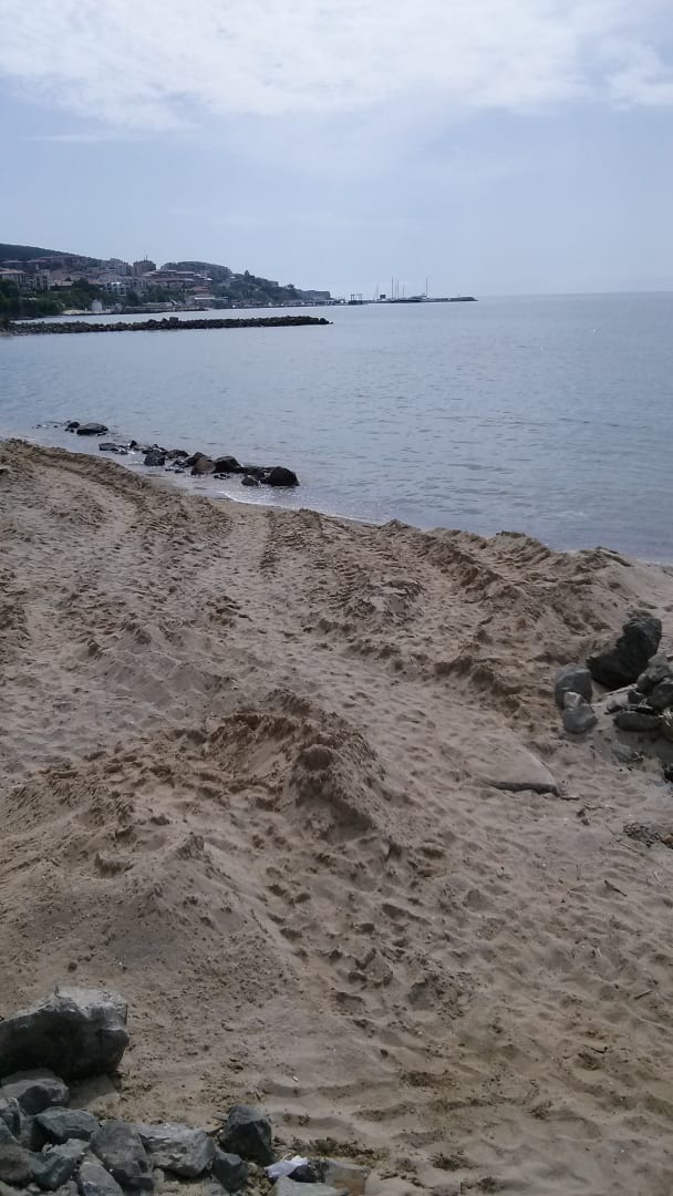 StrandHier ist der Strand links aufgeschüttet, man sieht noch die Reifenspuren. Aber der Sand ist schon wieder weg.