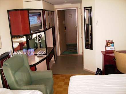 Blick in den Eingangsbereich eines Zimmers im Sokos Hotel Vaakuna - links die Minibar und der Fernseher, rechts der Schreibtisch