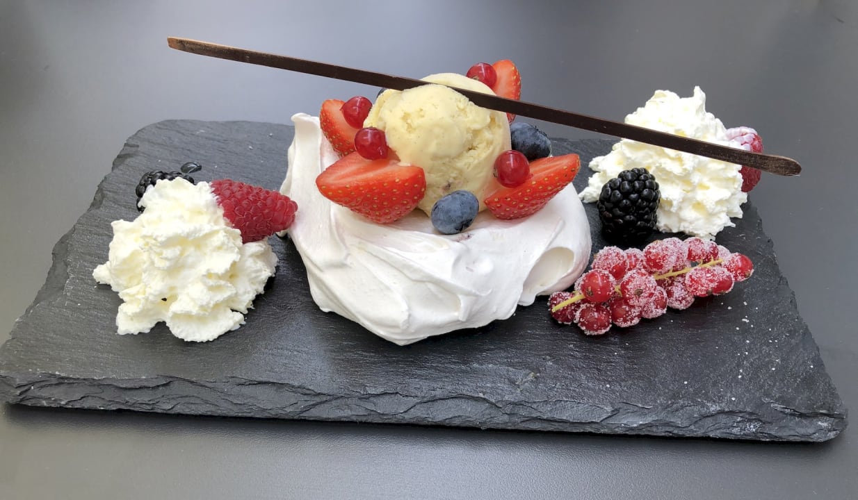 Dessert Pavlova (Baisertörtchen, Vanilleeis, frische Beeren und Sahne)