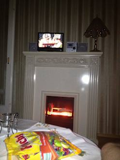 Das Wohnzimmer mit elt. Kamin