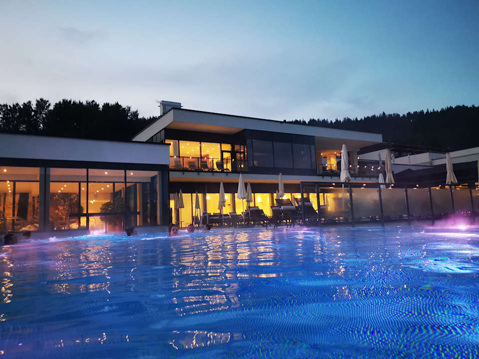 Blick vom Infinity Pool auf die Pool lounge und auf die Panorama Sauna