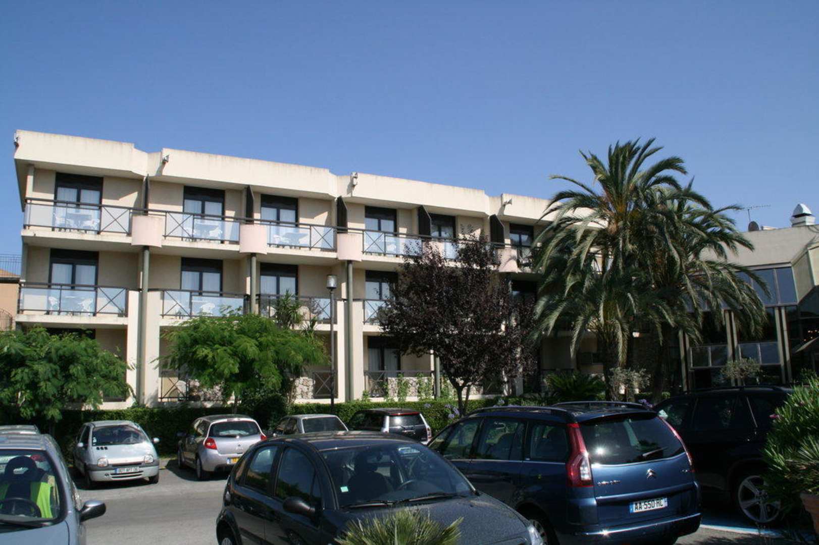 Blick vom Parkplatz auf das Hotel, Seitenansicht