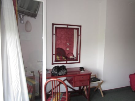 Vor dem Doppelbett ist ein Schreibtisch, in der Ece links vor der Balkontür ist ein Kühlschrank und darüber ist ein TV-Gerät montiert (deutsche Sender: ARD, ZDF, KIKA, RTL und SAT1).