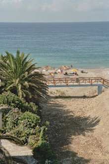 Der Ausblick von oben auf den Kiesstrand direkt beim Hotel: man sieht das ausgetrocknete Bachbett und die darüberführenden Brücke. Unter den Palmen links ist der Weg zum Strand.