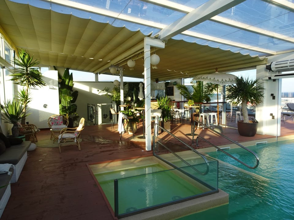 Dachpool mit Blick über den Hafen und nach Marokko