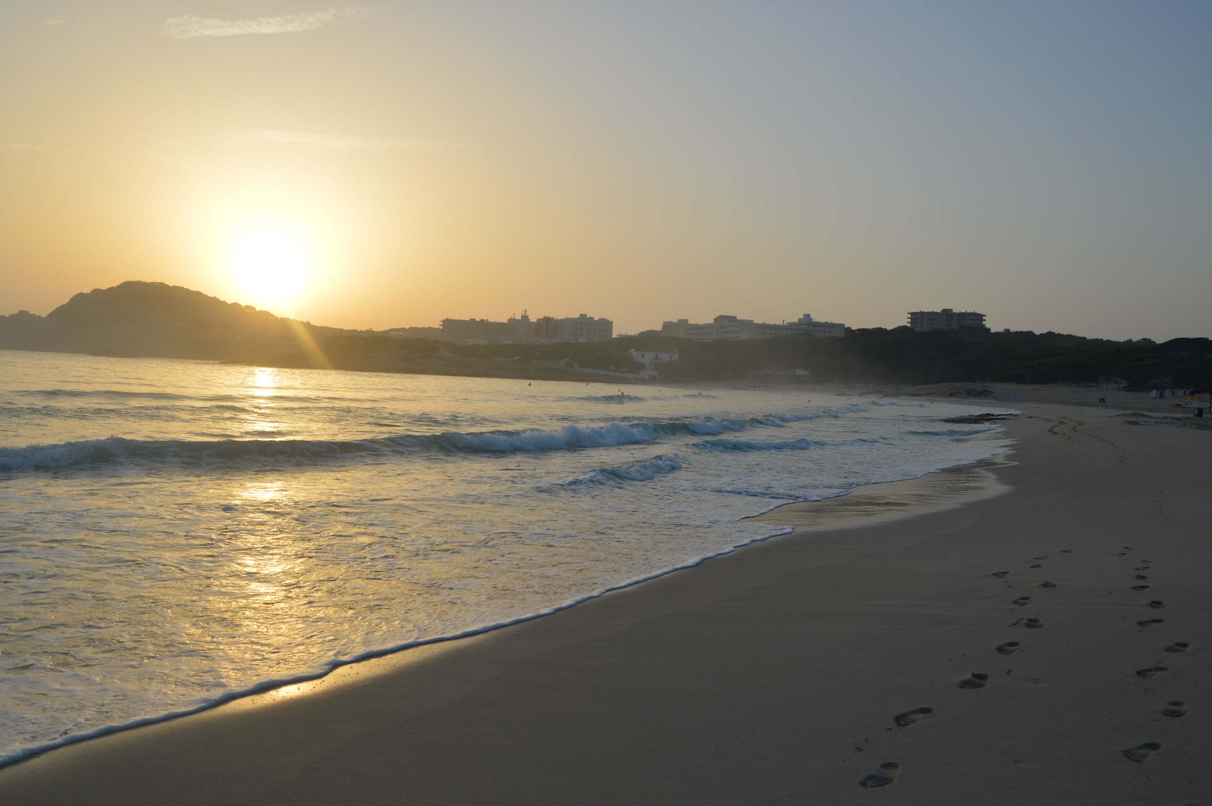 Lever de soleil sur la plage de Cala Agulla et l'hôtel S'entrador Playa.