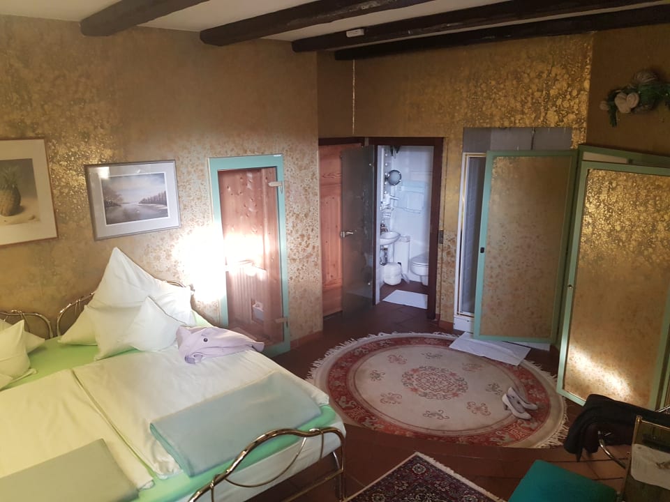 Das ist das Zimmer gewesen. Bei der Tür rechts neben dem Bett befindet sich die Sauna. Weiter rechts ist der Eingang zum Zimmer. Hinter der dritten glasige Tür ist das WC und ein Waschtisch. Dusche ist neben dem WC.