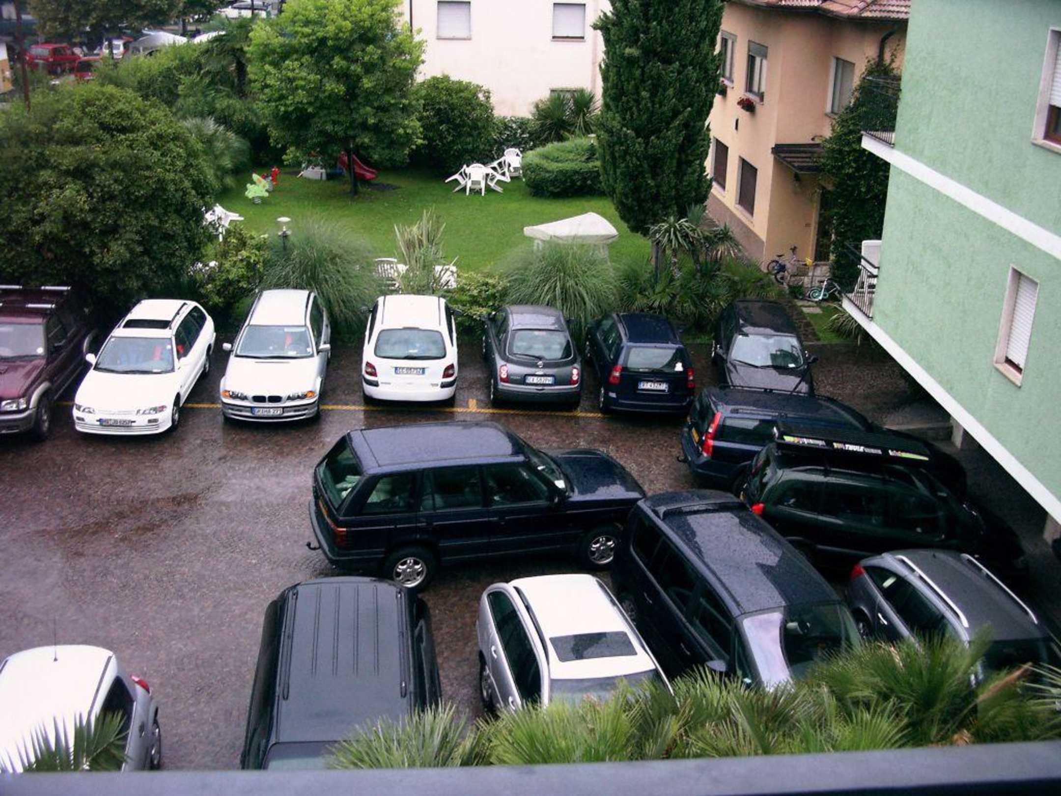 Der permanent überfüllte Parkplatz der Residendce. Der Fluch der bösen Tat: Je größer die Benzinfresser (Jeeps), desto kleiner der Parkplatz und desto überfüllter.